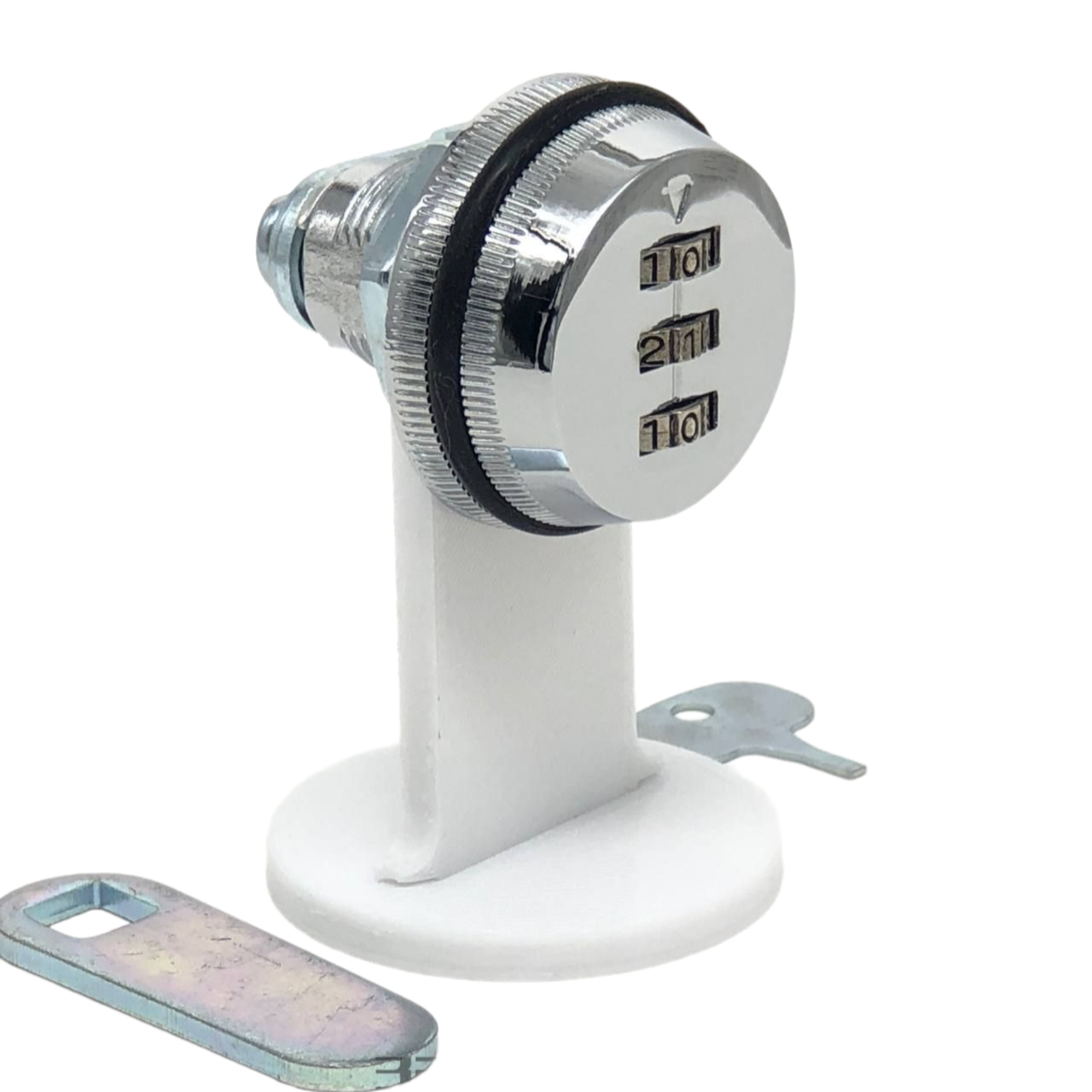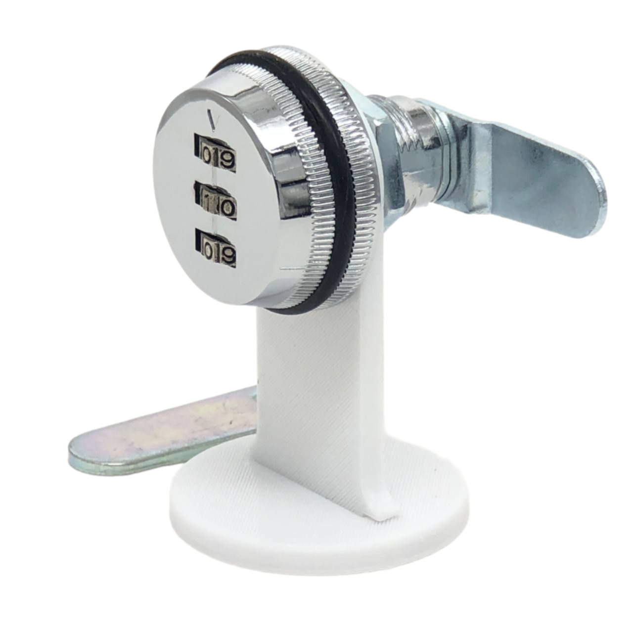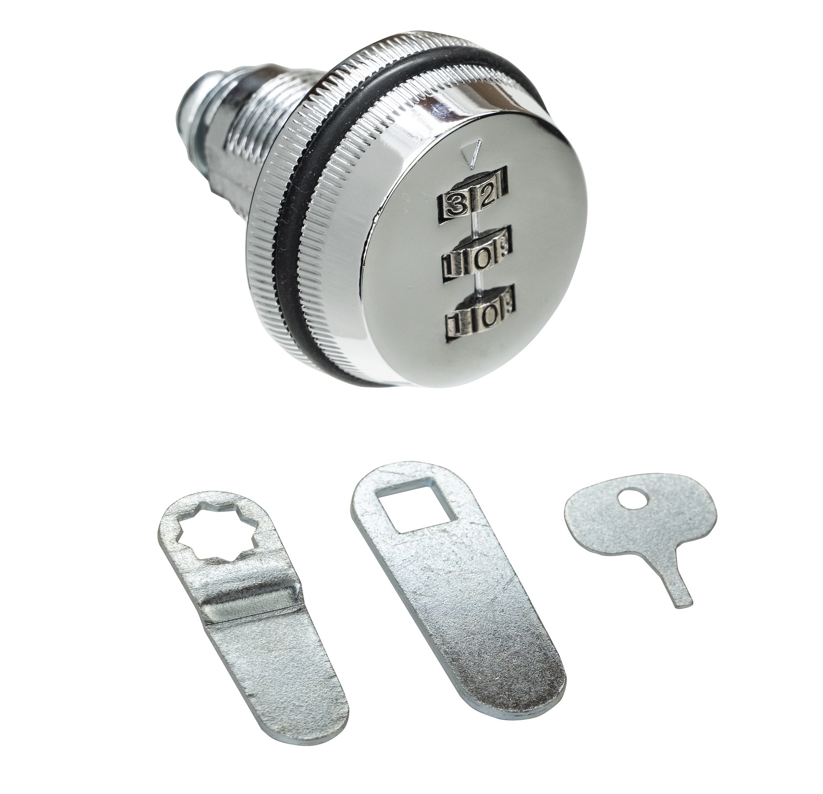 Замок мебельный кодовый почтовый 090 C цвет хром в блистерной индивидуальной упаковке. Код состоит из 3-х пронумерованных дисков, каждый диск имеет нумерацию от 0 до 9, что позволяет замку иметь 1000 комбинаций. Код устанавливается индивидуально владельцем. Смена пароля осуществляется так же самостоятельно. Функция восстановления забытого пароля отсутствует. На замке установлен заводской пароль «000». Способ установки нового кода ручку замка необходимо установить в положение «открыто». С боку на ручке маленькое круглое отверстие. Вставьте в него тонкую отвертку на 2 мм, и надавите с небольшим усилием, удерживая отвертку в этом положении, одновременно, покрутите диски и установите свой код. Отпустите отвертку. Новый код установлен.