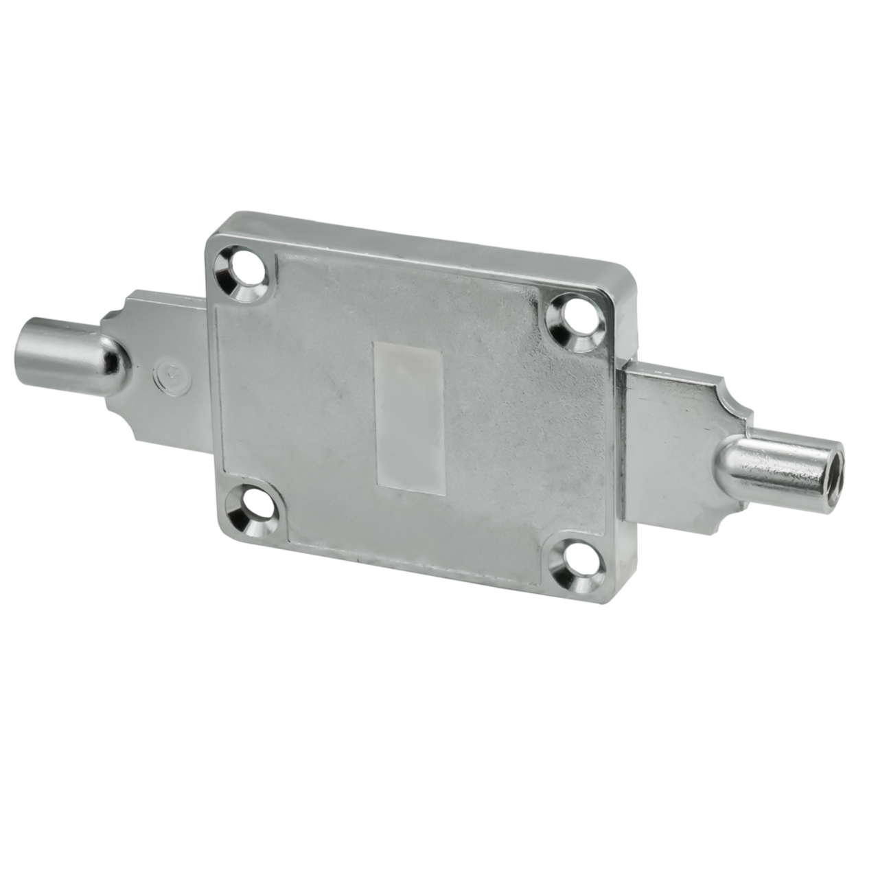 Замок мебельный ригельный под тяги предназначен для запирания мебельных распашных створок и ящиков.  Диаметр сверления под замок 20 мм. Изготовлен из качественного металла и покрыт гальванической хромированной плёнкой.