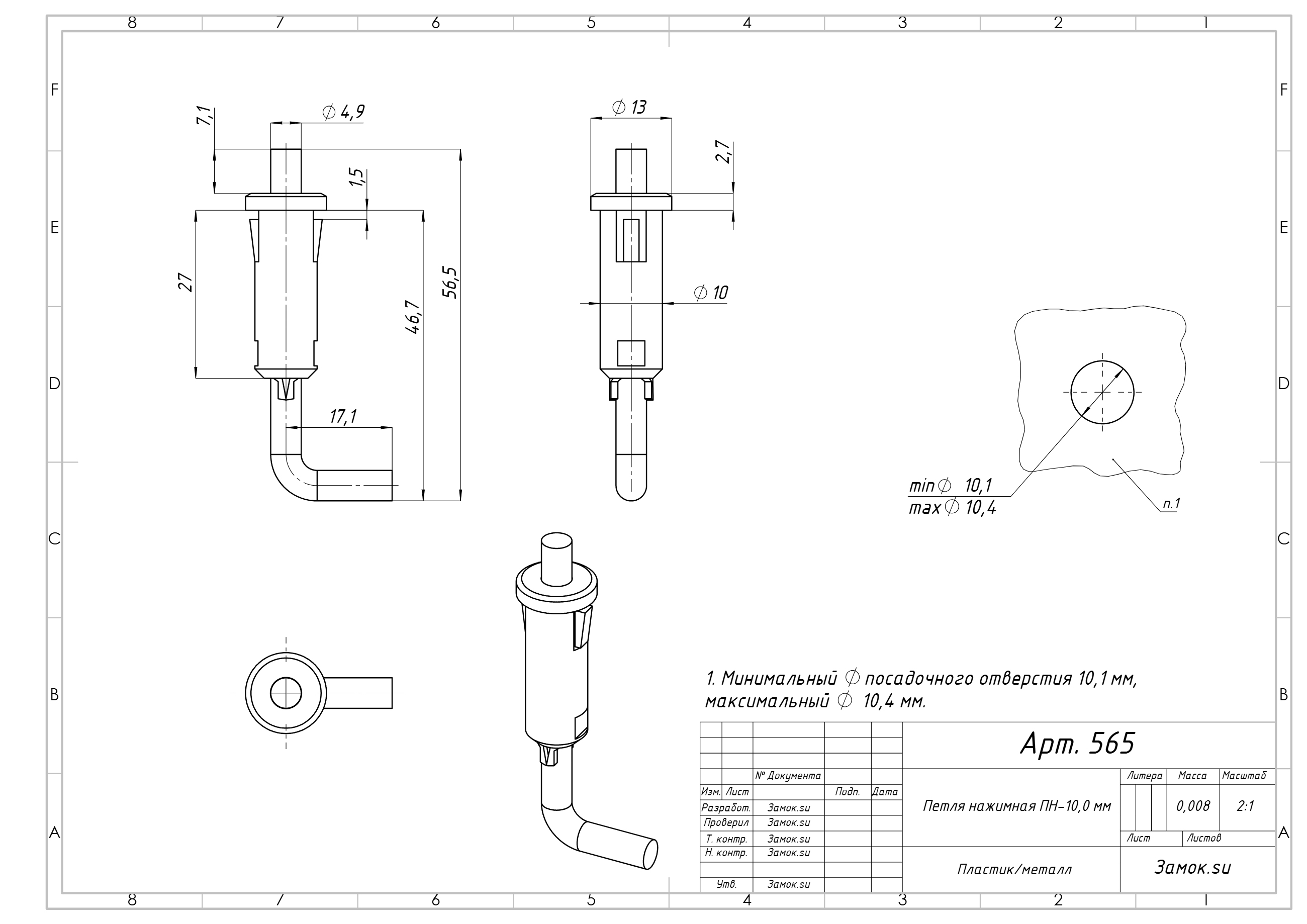 Петля нажимная ПН-10,0 мм используют при комплектации металлической мебели для установки дверей шкафов. Пружина изготовлена из стали. корпус из пластика. Благодаря этому петля обладает высоким уровнем прочности и служит долгий период времени.