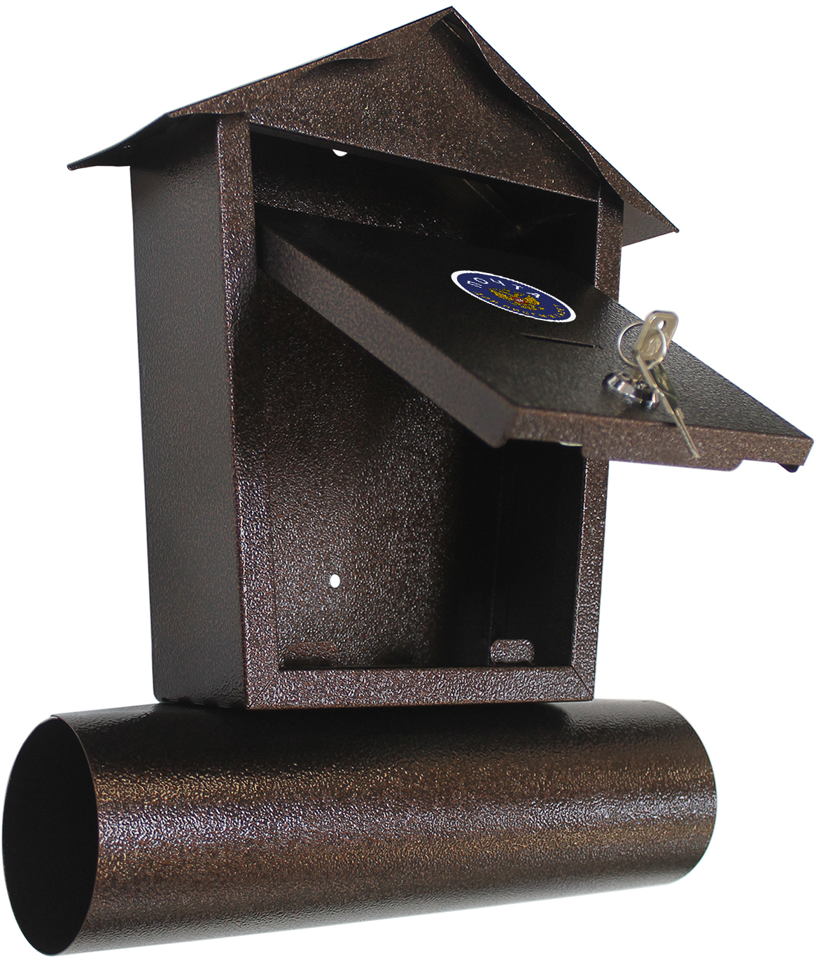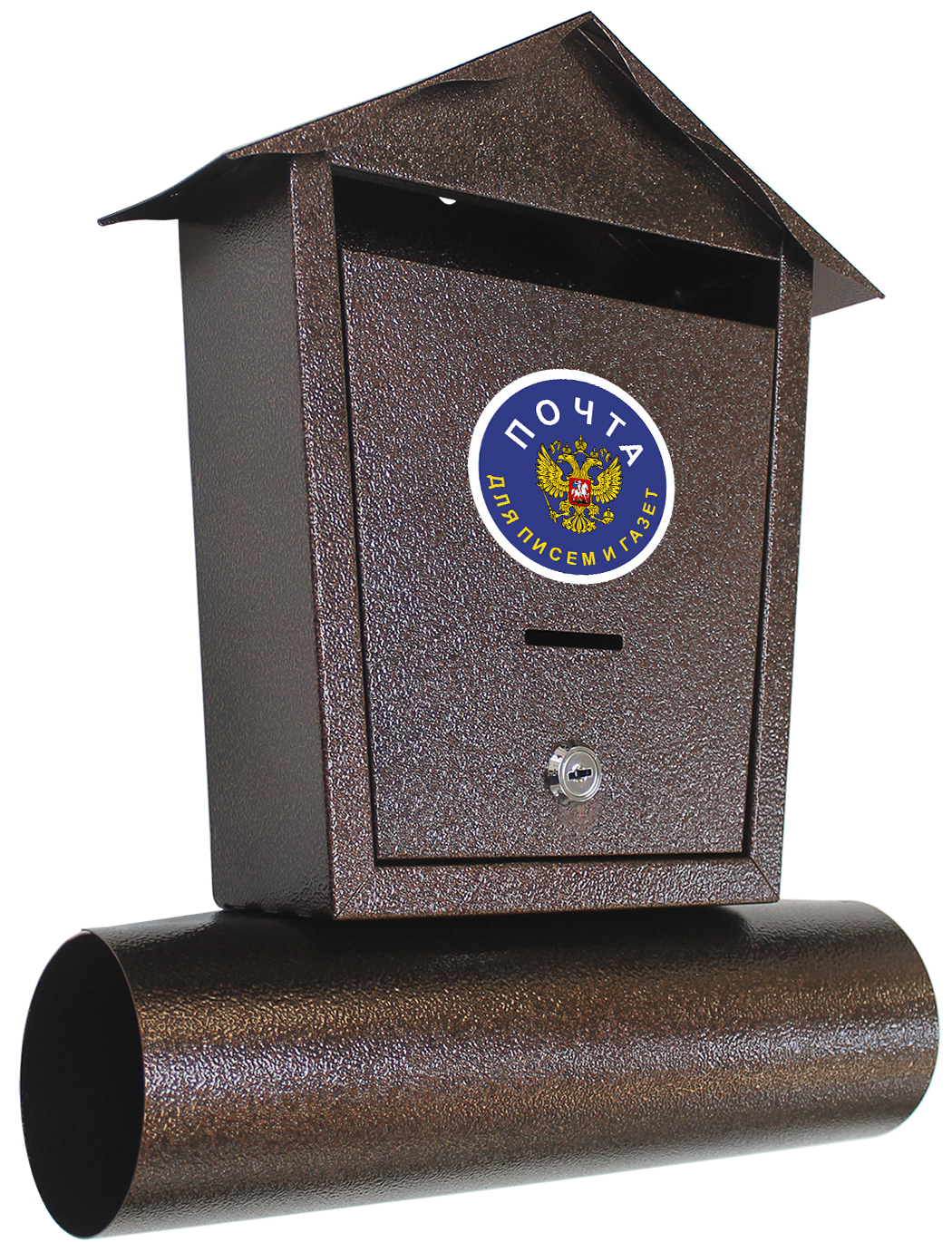 Ящик почтовый «Домик» со встроенным замком предназначен для индивидуального применения в частных и коттеджных домах. Выполнен в традиционном формате — в виде короба с прорезью для корреспонденции и дополнен тубусом для газет. Почтовый ящик покрыт полимерно-порошковым покрытием с эффектом антик, что подчёркивает ретро исполнение модели. Крепление выполняется с помощью отверстий, расположенных на задней стенке. Ящик оснащён прочной антивандальной конструкцией. Замок расположен на откидной крышке для корреспонденции. В комплект входит два ключа. Толщина стали изделия 0,6 мм.