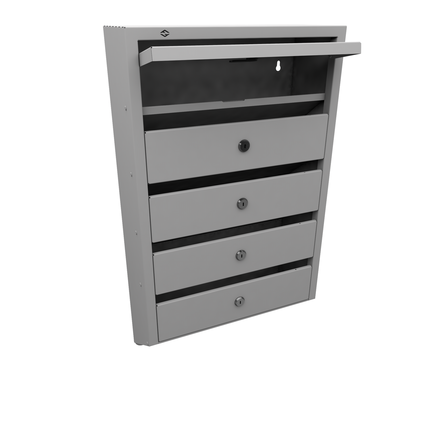 Многосейкционный почтовый ящик часто применяется в многоквартирных домах, офисных или административных зданиях. Ящик содержит 5 отделений для почты (секции), каждое из которых оснащено индивидуальной дверцей. Все отделения располагается под углом 50 градусов. Благодаря этому почтовый ящик выглядит компактно и в тоже время очень вместителен, что позволяет помещать в него и объёмную корреспонденцию так же. Дверца открывается снизу-вверх. Конструкция оснащена задней стенкой, что предотвращает попадание тонких писем в чужие ячейки. На каждой секции установлен секретный замок в комплекте с двумя ключами.