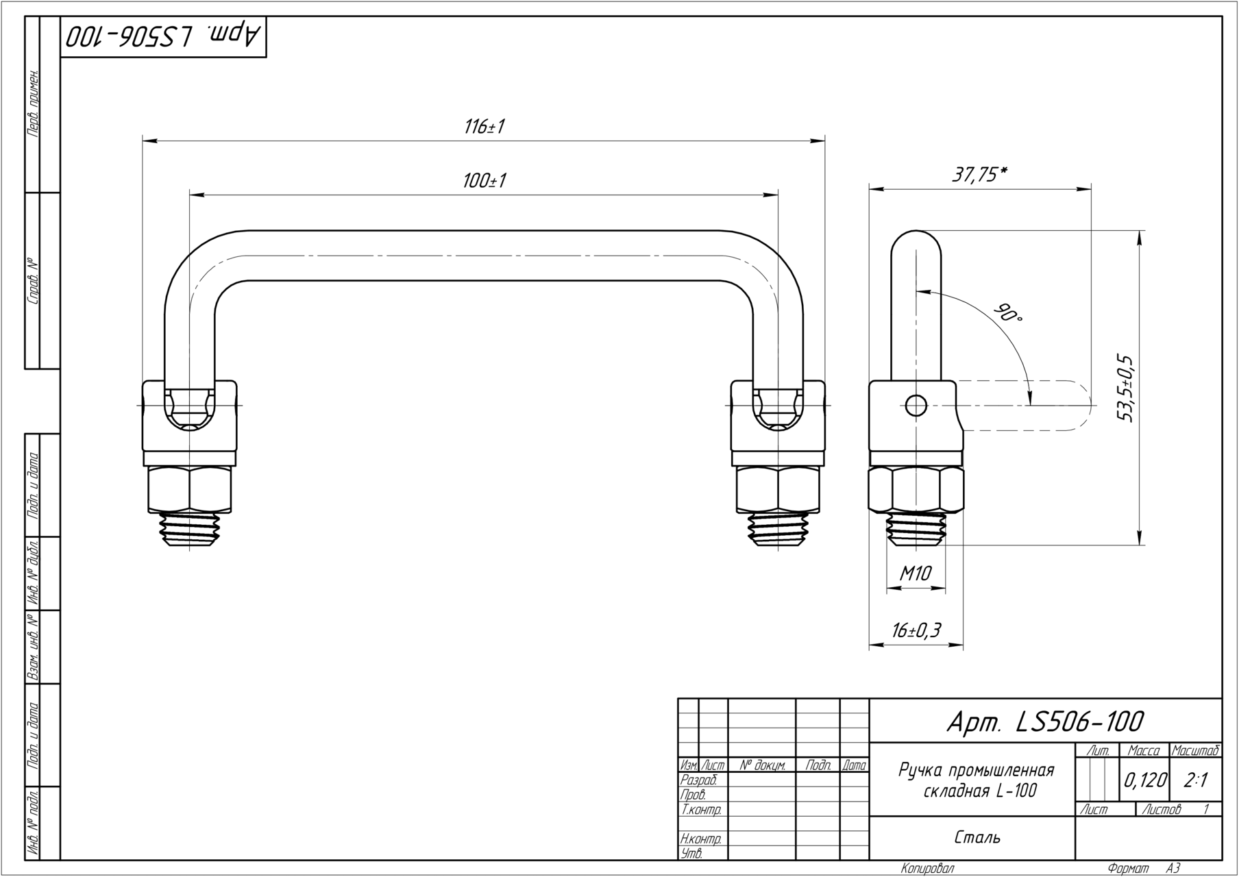 Ручка промышленная складная L-100 цельнометаллические с поворотным креплением. Изделие крепится на шпильки.