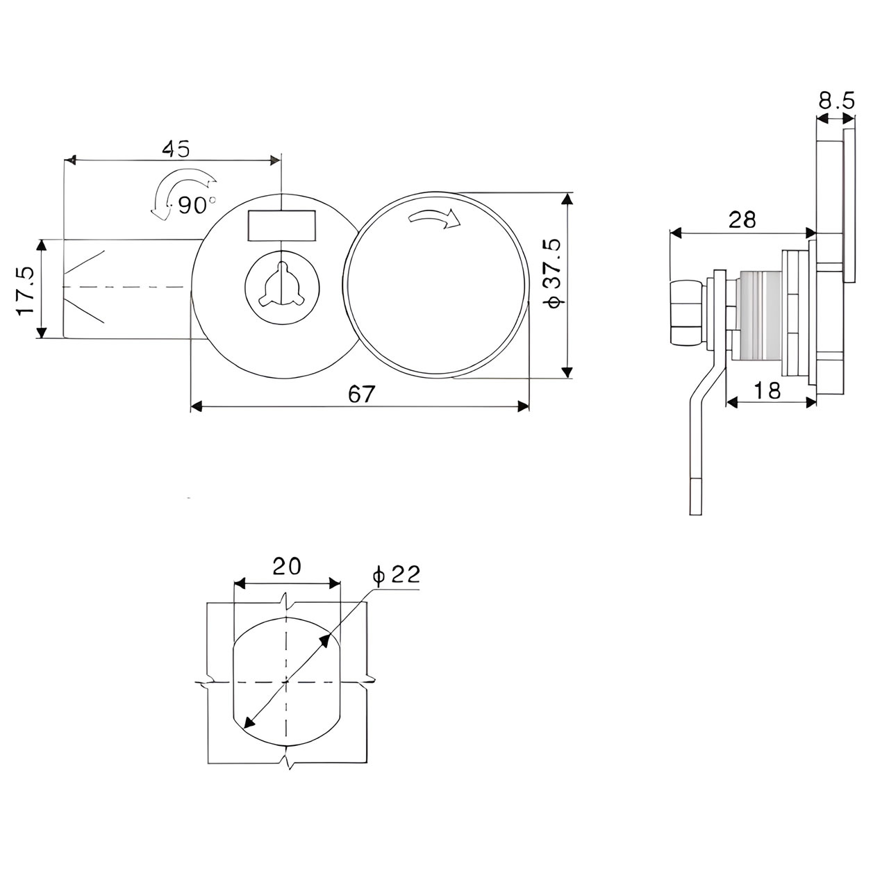 Замок мебельный MS-1925-1KD/P (ригель изогнутый /+8 мм/, английский ключ)