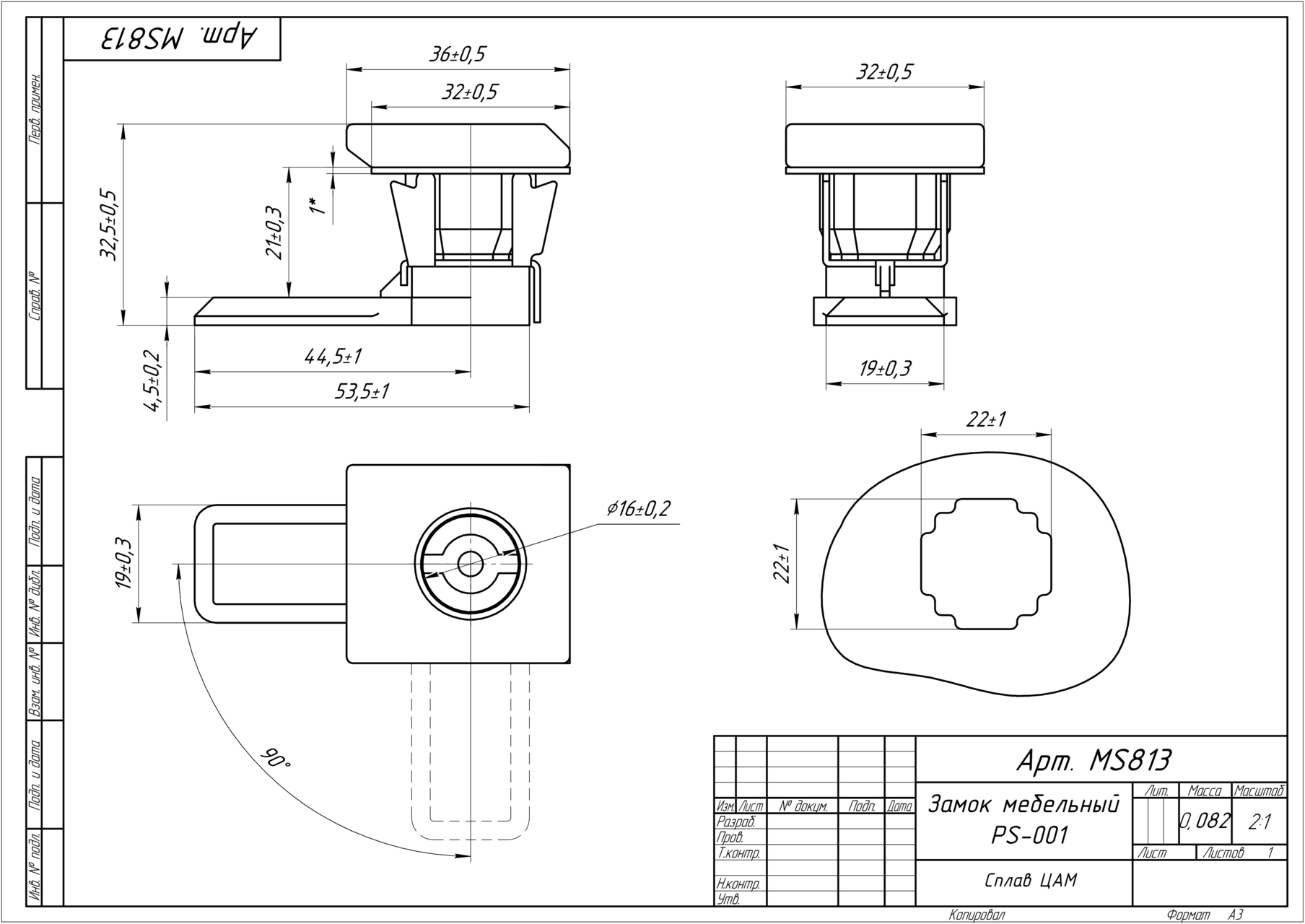 Замок возможно установки как на левую, так и на правую дверцы. Механизм запирания вращается на четверть оборота (90 градусов).